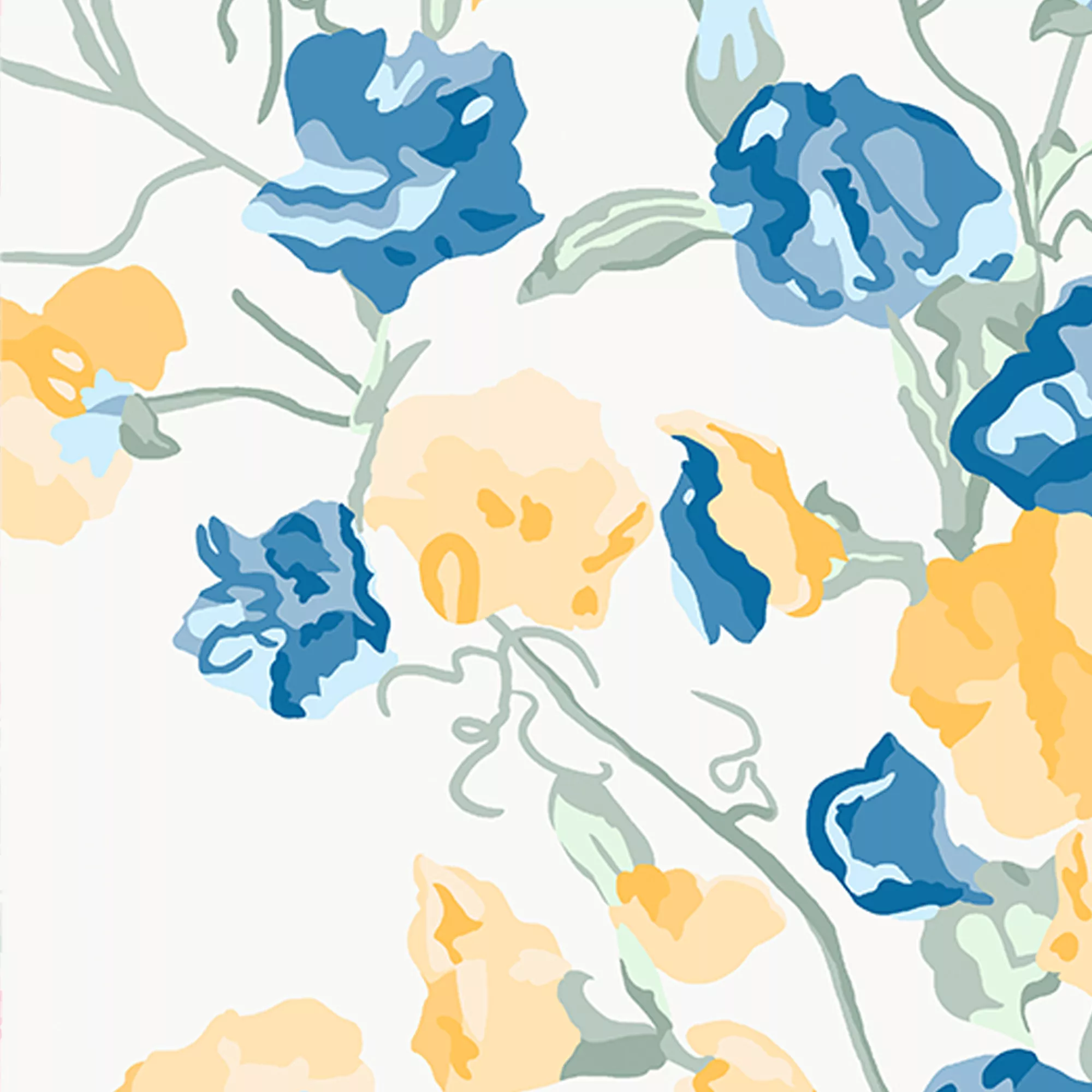 Sunny yellows meet blossoming blues in this heritage inspired print. Charlotte features intertwined bunches of sweetpeas cast amongst scrolling tendrils and falling leaves. This soft and delicate pattern has a beautiful vintage feel to it.